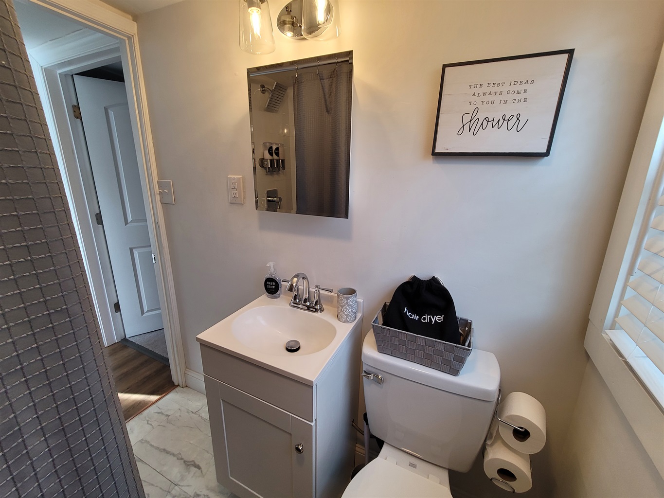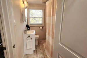 Bathroom is updated with a rainfall shower head. Shampoo, conditioner and body wash are provided for your convenience. The bathroom is a bit small as this house was built in 1900.